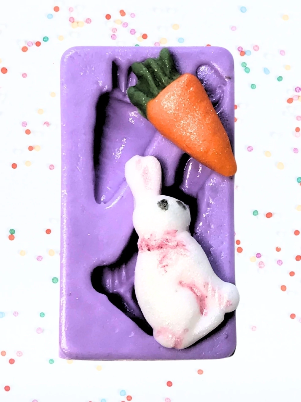 Molde de silicone para decorar e artesanato. A cor do molde pode variar mediante disponibilidade. Tamanho total do molde: 4,5 x 2,5 cm Tamanho interno aproximado: 2,5 x 1,5 cm (coelho) / 2 x 1 cm (cenoura)