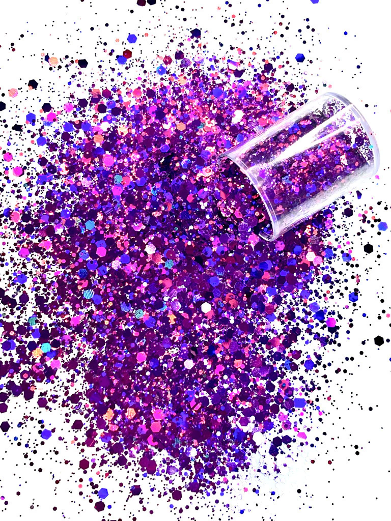 "Glitter Holográfico especial em poliéster importado formato hexagonal, possui brilho intenso com partículas refletoras de luz que promovem um efeito incrível, fabricados em 3 tamanhos de flocos.