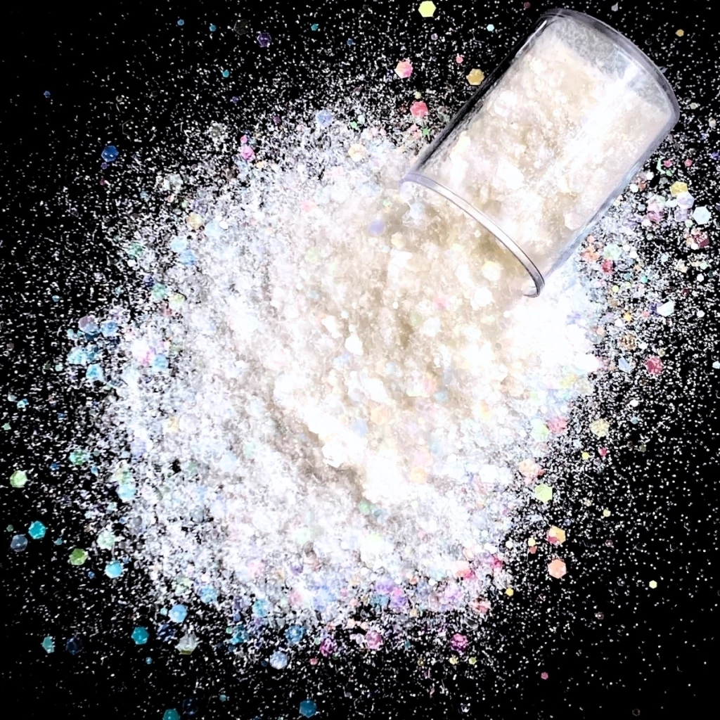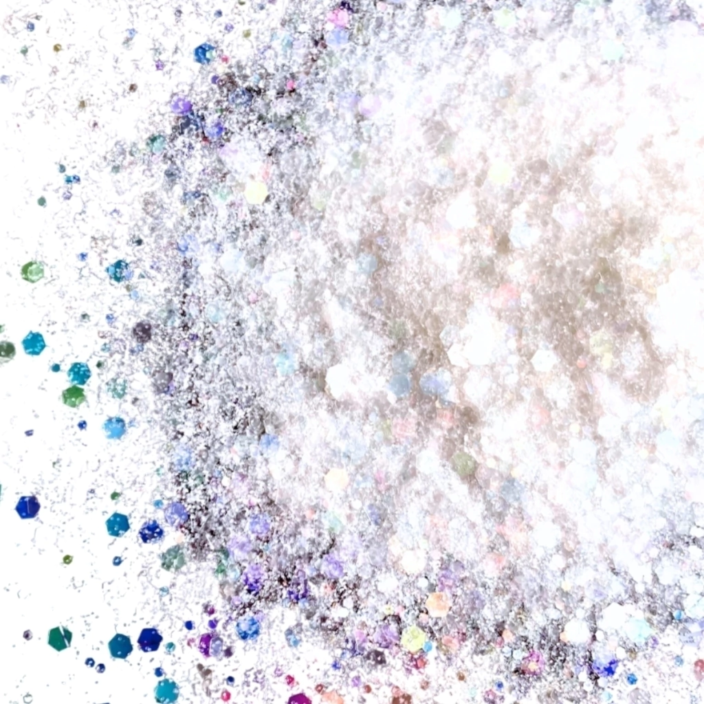 "Glitter Holográfico especial em poliéster importado formato hexagonal, possui brilho intenso com partículas refletoras de luz que promovem um efeito incrível, fabricados em 3 tamanhos de flocos.