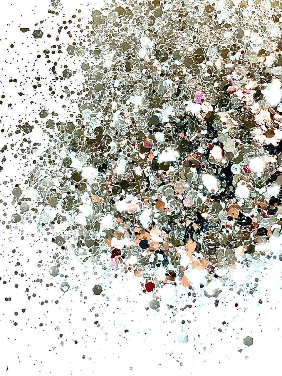 Glitter Metálico especial em poliéster importado formato hexagonal, possui brilho intenso com partículas refletoras de luz que promovem um efeito incrível, fabricados em 3 tamanhos de flocos.