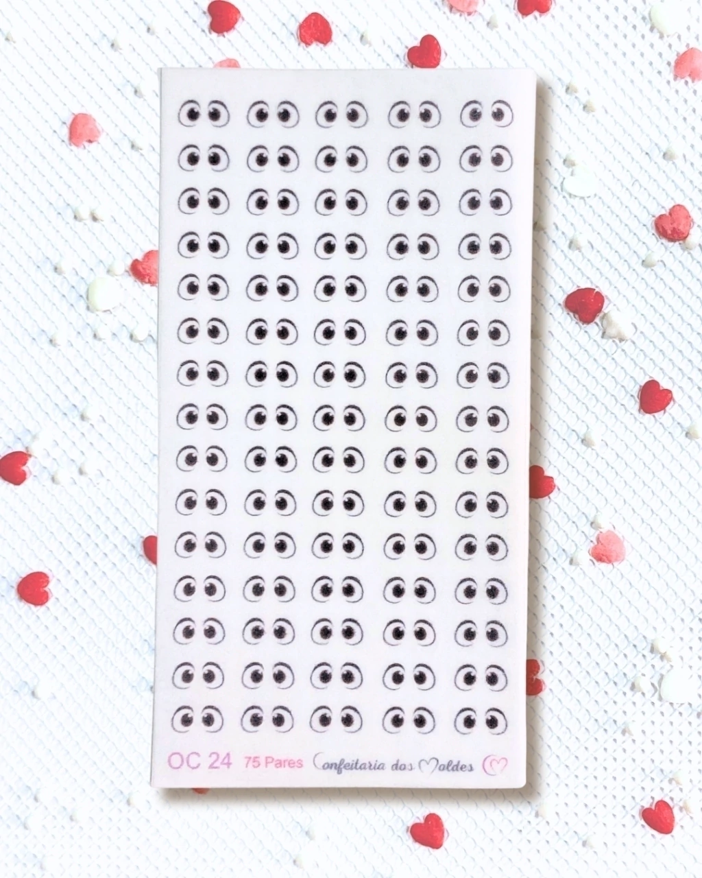 Cartela de olhos comestíveis destacáveis contendo 75 pares produzidos em papel de arroz, próprio para confeitaria e indicado para utilizar em doces feitos com pasta de açúcar ou pasta de leite em pó. Manusear com delicadeza para não rasgar e/ou amassar.