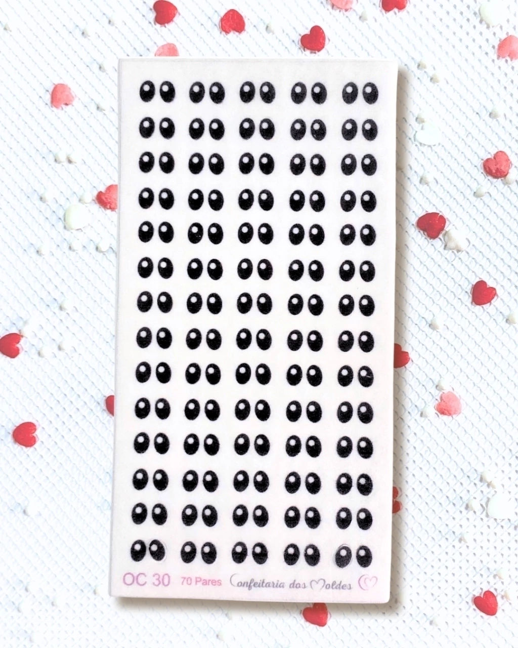 Cartela de olhos comestíveis destacáveis contendo 70 pares produzidos em papel de arroz, próprio para confeitaria e indicado para utilizar em doces feitos com pasta de açúcar ou pasta de leite em pó. Manusear com delicadeza para não rasgar e/ou amassar.