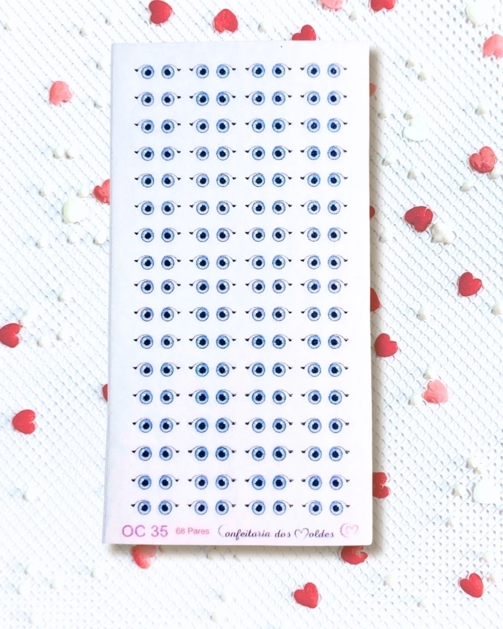 Cartela de olhos comestíveis destacáveis contendo 68 pares produzidos em papel de arroz, próprio para confeitaria e indicado para utilizar em doces feitos com pasta de açúcar ou pasta de leite em pó. Manusear com delicadeza para não rasgar e/ou amassar.