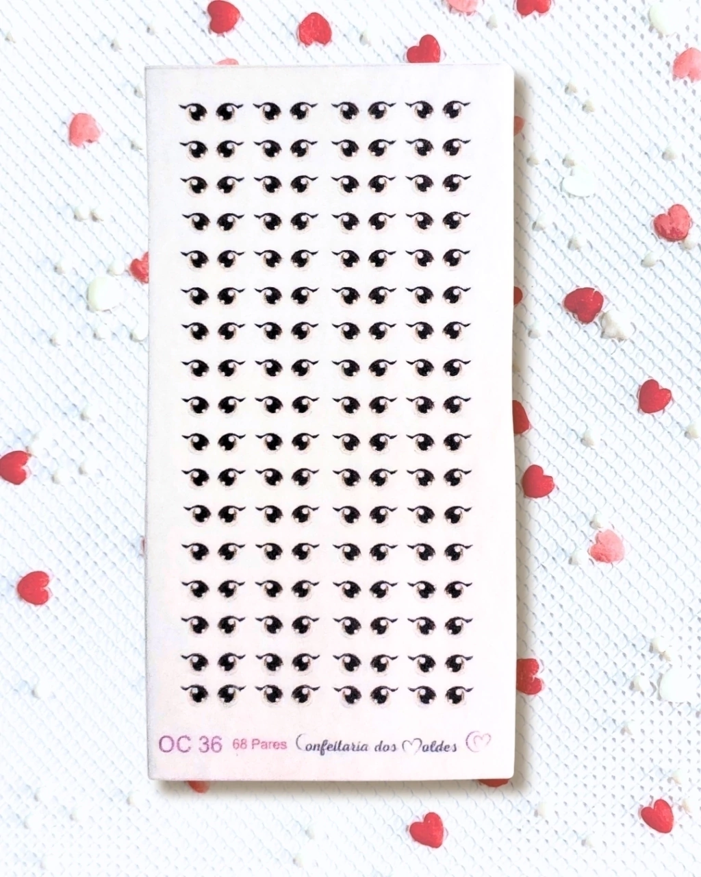 Cartela de olhos comestíveis destacáveis contendo 68 pares produzidos em papel de arroz, próprio para confeitaria e indicado para utilizar em doces feitos com pasta de açúcar ou pasta de leite em pó. Manusear com delicadeza para não rasgar e/ou amassar.