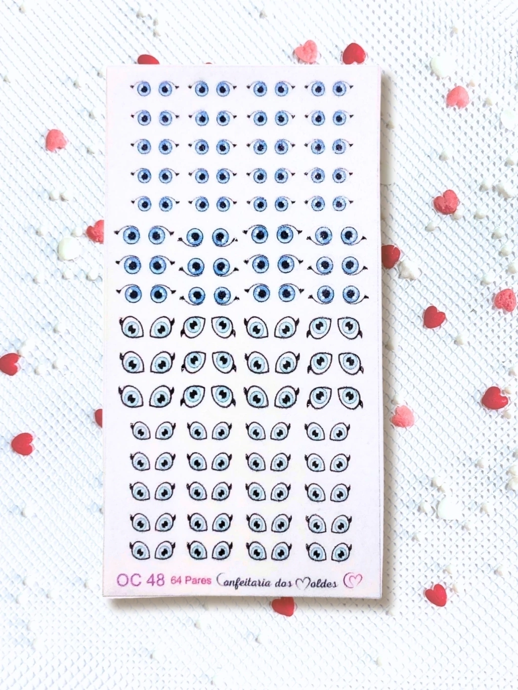 Cartela de olhos comestíveis destacáveis contendo 64 pares sendo 40 pares P + 24 pares G, produzidos em papel de arroz, próprio para confeitaria e indicado para utilizar em doces feitos com pasta de açúcar ou pasta de leite em pó. Manusear com delicadeza para não rasgar e/ou amassar.