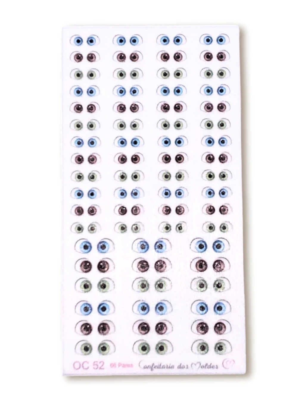 Cartela de olhos comestíveis destacáveis contendo 66 pares sendo 66 pares P + 18 pares G, produzidos em papel de arroz, próprio para confeitaria e indicado para utilizar em doces feitos com pasta de açúcar ou pasta de leite em pó. Manusear com delicadeza para não rasgar e/ou amassar.