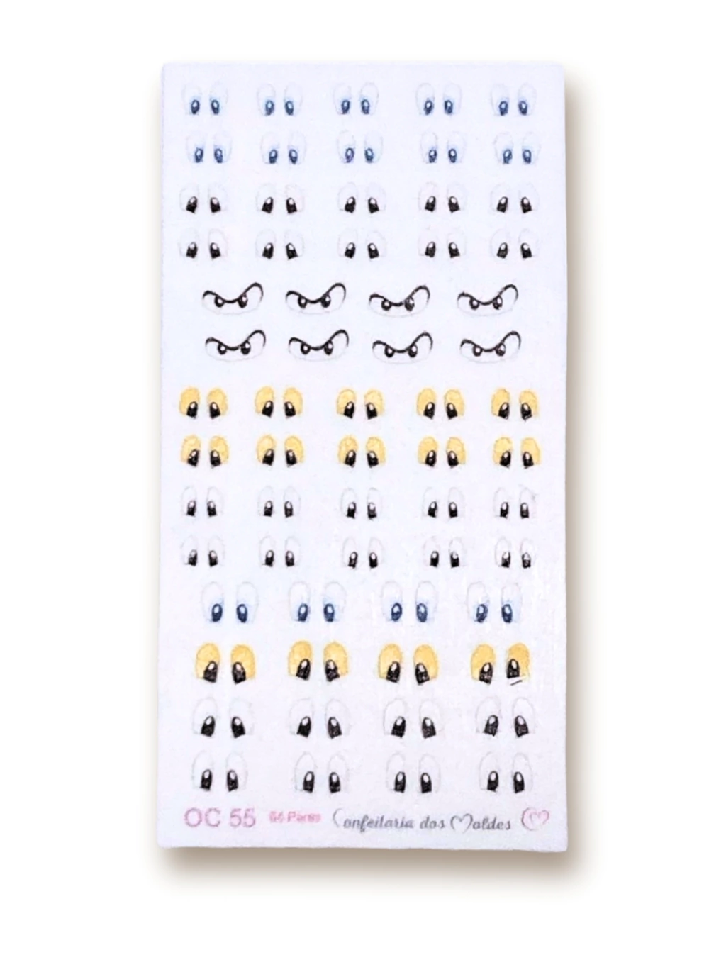 Cartela de olhos comestíveis destacáveis contendo 64 pares diversos, produzidos em papel de arroz, próprio para confeitaria e indicado para utilizar em doces feitos com pasta de açúcar ou pasta de leite em pó. Manusear com delicadeza para não rasgar e/ou amassar.
