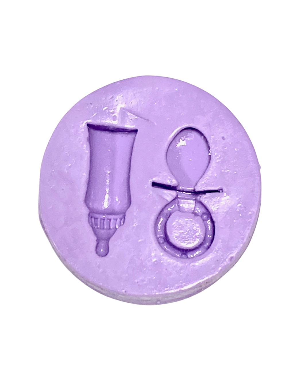 Tamanho de cada item individual após modelagem: 2x3,5cm (chupeta)/ 3,5cmx1,5cm (mamadeira)
