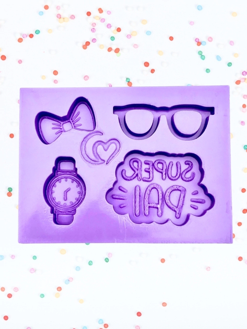 Tamanho de cada item individual após modelagem: 1,5 x 1 cm (gravata), 3 x 2 cm (pai), 2,5 x 1 cm (óculos), 2 x 1 cm (óculos)