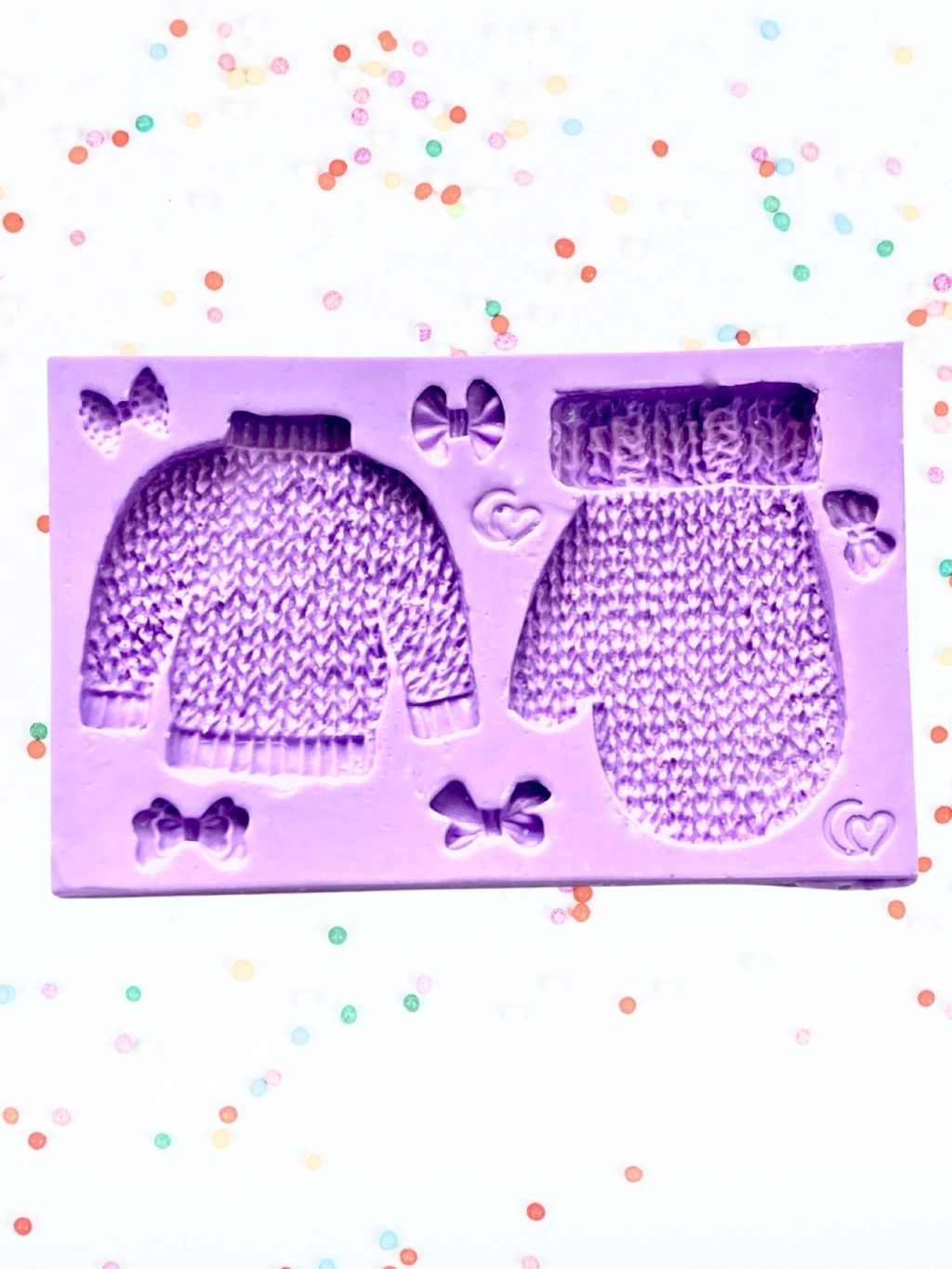 Tamanho de cada item individual após modelagem: 7 x 5 cm (luva), 6 x 5,5 cm (sueter)