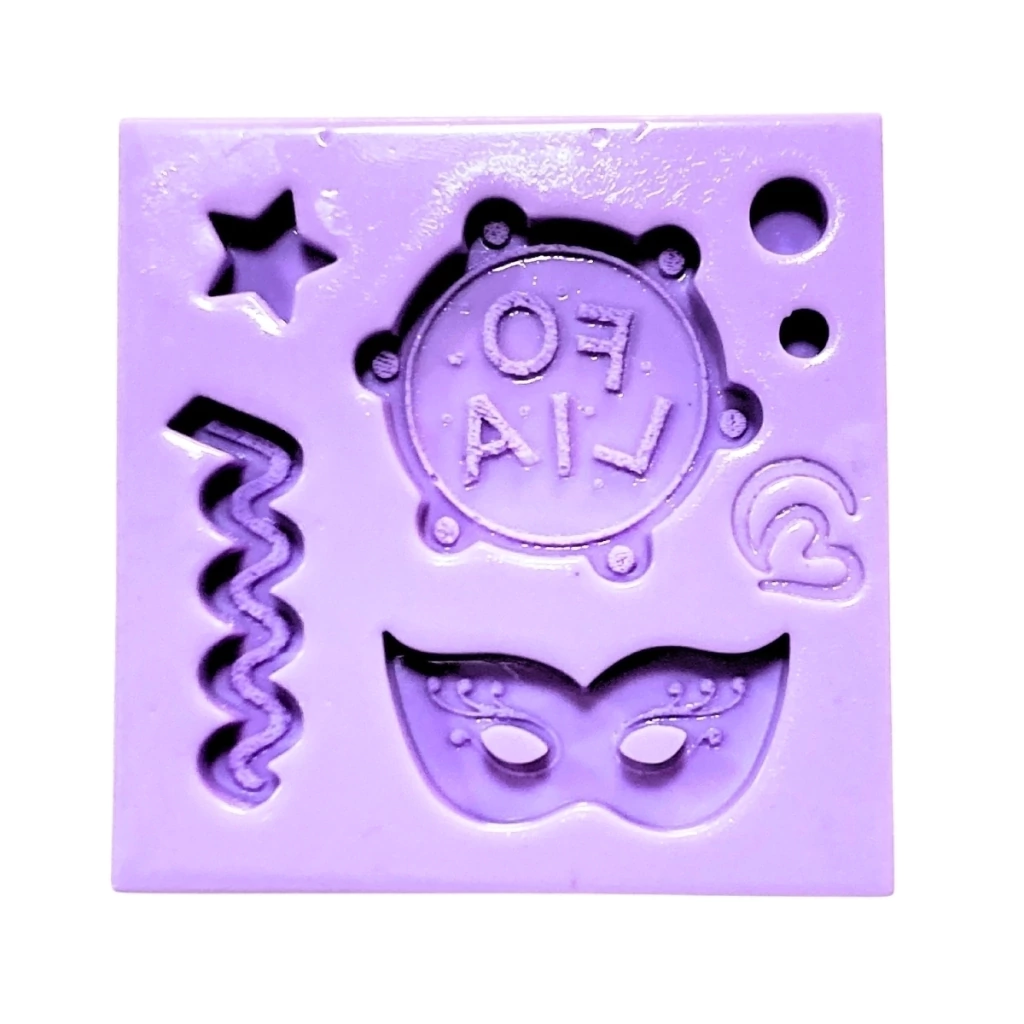 Tamanho interno aproximado: 3 x 1,5 cm (máscara) / 3 cm (pandeiro) / 3 x 0,5 cm (serpentina) / 1 cm (estrela)
