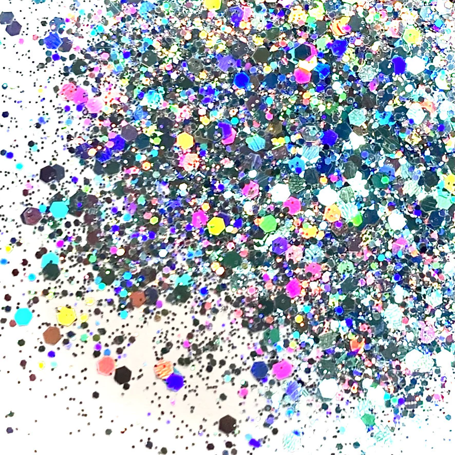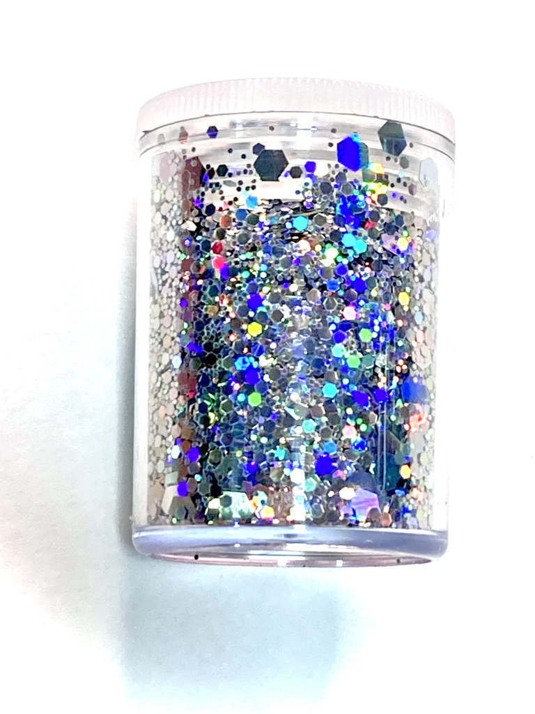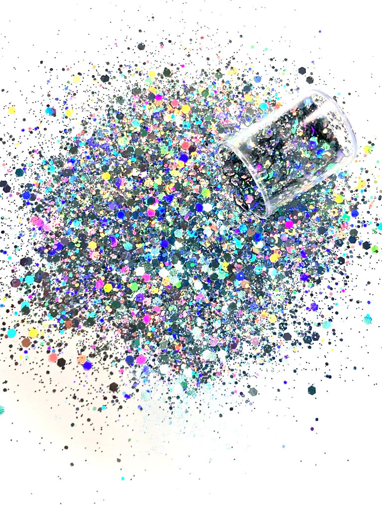 "Glitter holográfico em poliéster importado formato hexagonal, possui brilho intenso com partículas refletoras de luz que promovem um efeito incrível, fabricados em 3 tamanhos de flocos que mudam de cor conforme se movimentam. Ideal para decoração de unhas, maquiagem, corpo, cosméticos, resinas, balões e artigos de festas, DIY, serigrafia, roupas, calçados, scrapbooking, colas, tintas. Produto atóxico – contém 50 gramas A cor pode sofrer variações de acordo com cada monitor, o peso pode sofrer alterações para mais ou menos gramas devido a calibragem da balança.