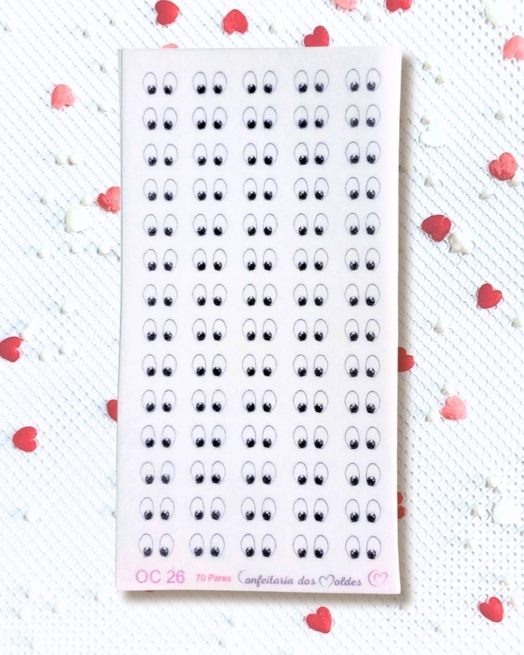 Cartela de olhos comestíveis destacáveis contendo 70 pares produzidos em papel de arroz, próprio para confeitaria e indicado para utilizar em doces feitos com pasta de açúcar ou pasta de leite em pó. Manusear com delicadeza para não rasgar e/ou amassar.