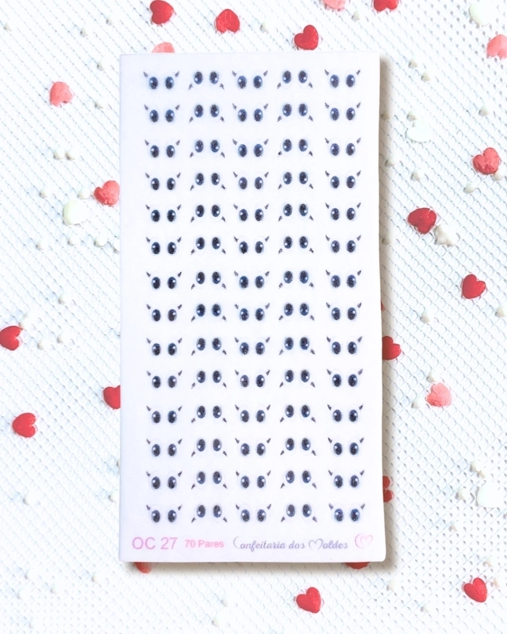 Cartela de olhos comestíveis destacáveis contendo 70 pares produzidos em papel de arroz, próprio para confeitaria e indicado para utilizar em doces feitos com pasta de açúcar ou pasta de leite em pó. Manusear com delicadeza para não rasgar e/ou amassar.