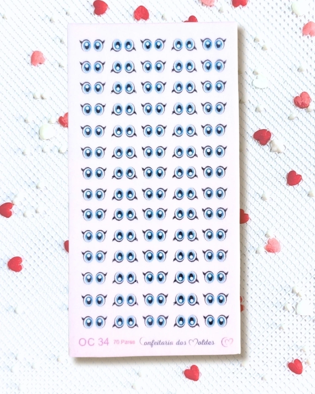 Cartela de olhos comestíveis destacáveis contendo 70 pares produzidos em papel de arroz, próprio para confeitaria e indicado para utilizar em doces feitos com pasta de açúcar ou pasta de leite em pó. Manusear com delicadeza para não rasgar e/ou amassar.