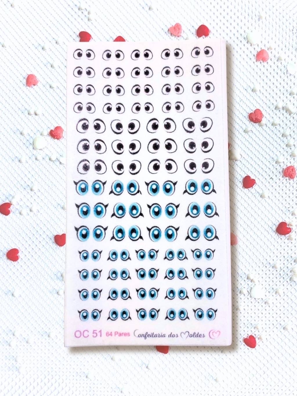 Cartela de olhos comestíveis destacáveis contendo 64 pares sendo 40 pares P + 24 pares G, produzidos em papel de arroz, próprio para confeitaria e indicado para utilizar em doces feitos com pasta de açúcar ou pasta de leite em pó. Manusear com delicadeza para não rasgar e/ou amassar.